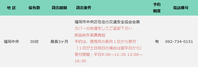 貸出可能なチャイルドシートの保有数、貸出可能期間、貸出要件等は地区ごとに異なっていますので、貸出を希望される方は、一度居住地域の交通安全協会に問合せしてみてはいかがでしょうか。